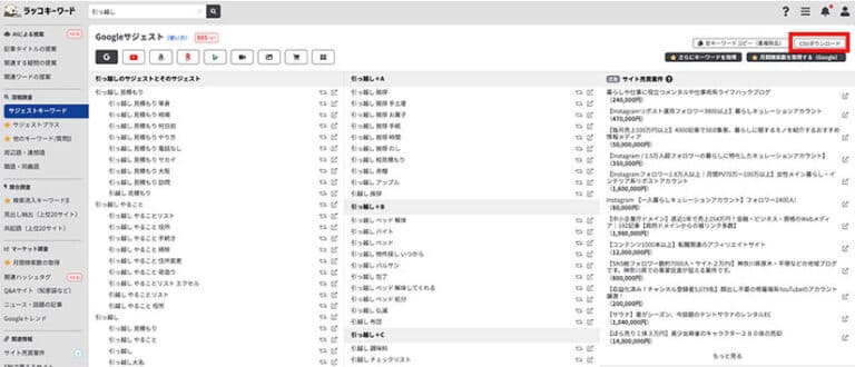 無料版ではキーワードのボリューム(月間検索数)までは調べることができないため、ラッコキーワードでは検索したいキーワードを入力し、そのサジェストキーワードをCSVでダウンロードしましょう。