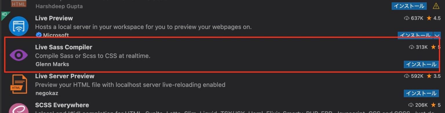 まずはマーケットプレイスから「Live Sass Compiler」検索します。