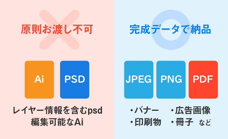 ノベルティで納品するデータは、バナーならJPEGやPNG、冊子ならPDFなど、ご依頼の用途に合わせた完成データのみとなります。