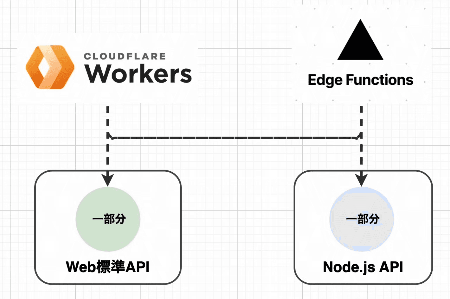 そしてまた厄介なのが、実はエッジランタイムというのは総称に過ぎません。Workersも他の代表的なエッジランタイムもWeb標準APIとNode.js APIの一部から、各社それぞれの判断で固有のエッジランタイムを形成しており厳密には一致しないそうです。まだ全然詳しくないけどそこまで意識したことはなかった。。😓