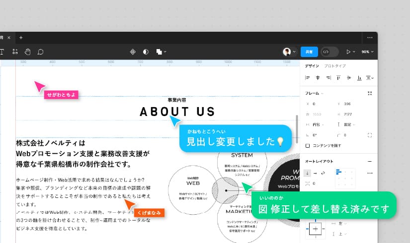 Figmaは1ファイルに複数ユーザーが同時にアクセスして作業をすることができるので、常にお互いの進捗を確認しながら進めることができます。
