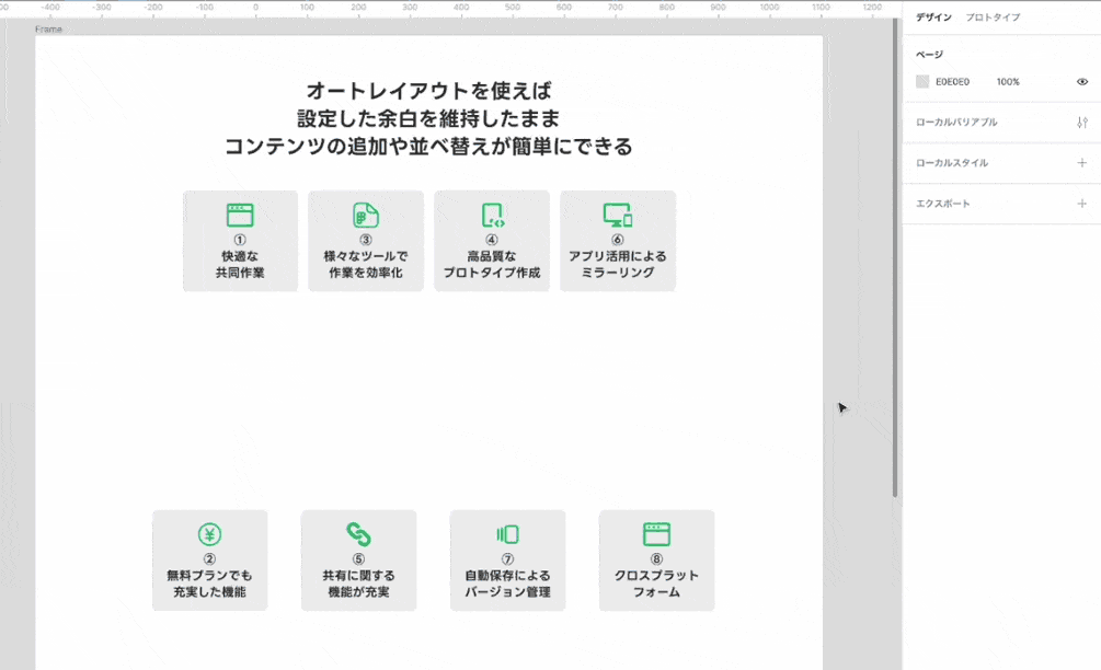 オートレイアウト機能を活用することで、要素間の余白が入力した数値になるように自動で調整され、適用したエリアにさらに要素を追加すると同じ余白で均等に並べてくれます。