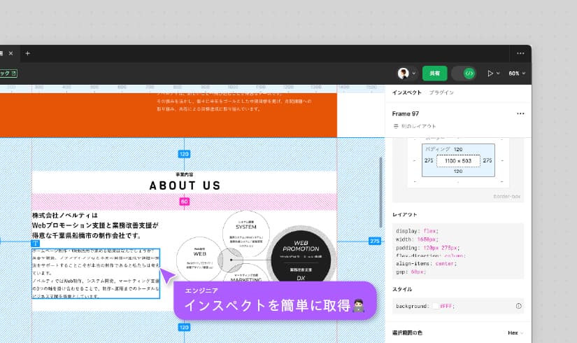 構築に必要な寸法などの値(インスペクト)を素早く取得できるだけでなく、HTMLとCSSのコードが取得できるのでコーダーの作業効率が格段にアップしました。