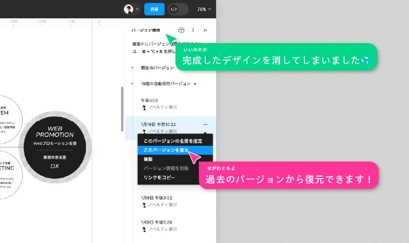 万が一完成したデザインを削除したまま自動保存されてしまったとしても、過去のバージョンに巻き戻って復元することができるので安心です。