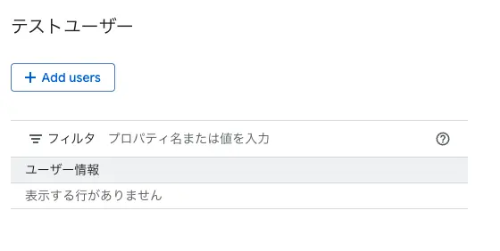 次にテストユーザーを設定します。(現状、Google OAuthをテストモードで動作させているため、この設定が必要です。)