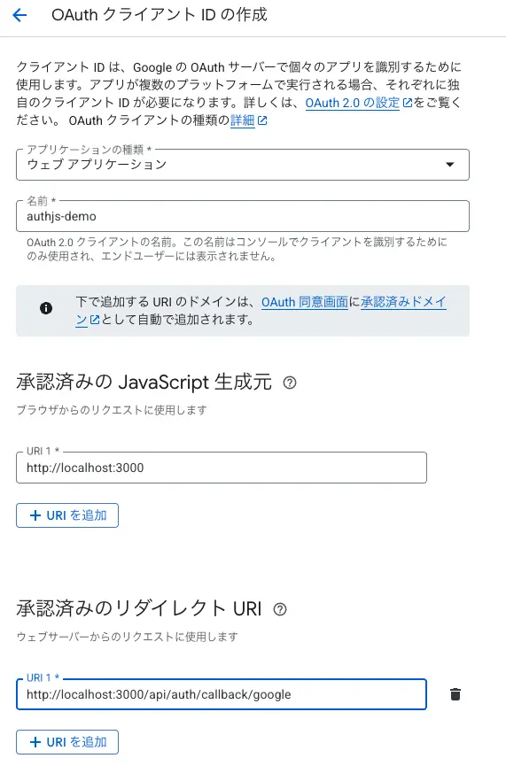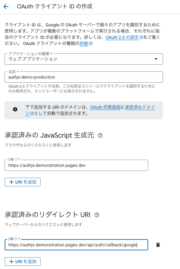 AUTH_GOOGLE_SECRET={クライアントシークレット}また本番環境向けのOAuth設定も行います。