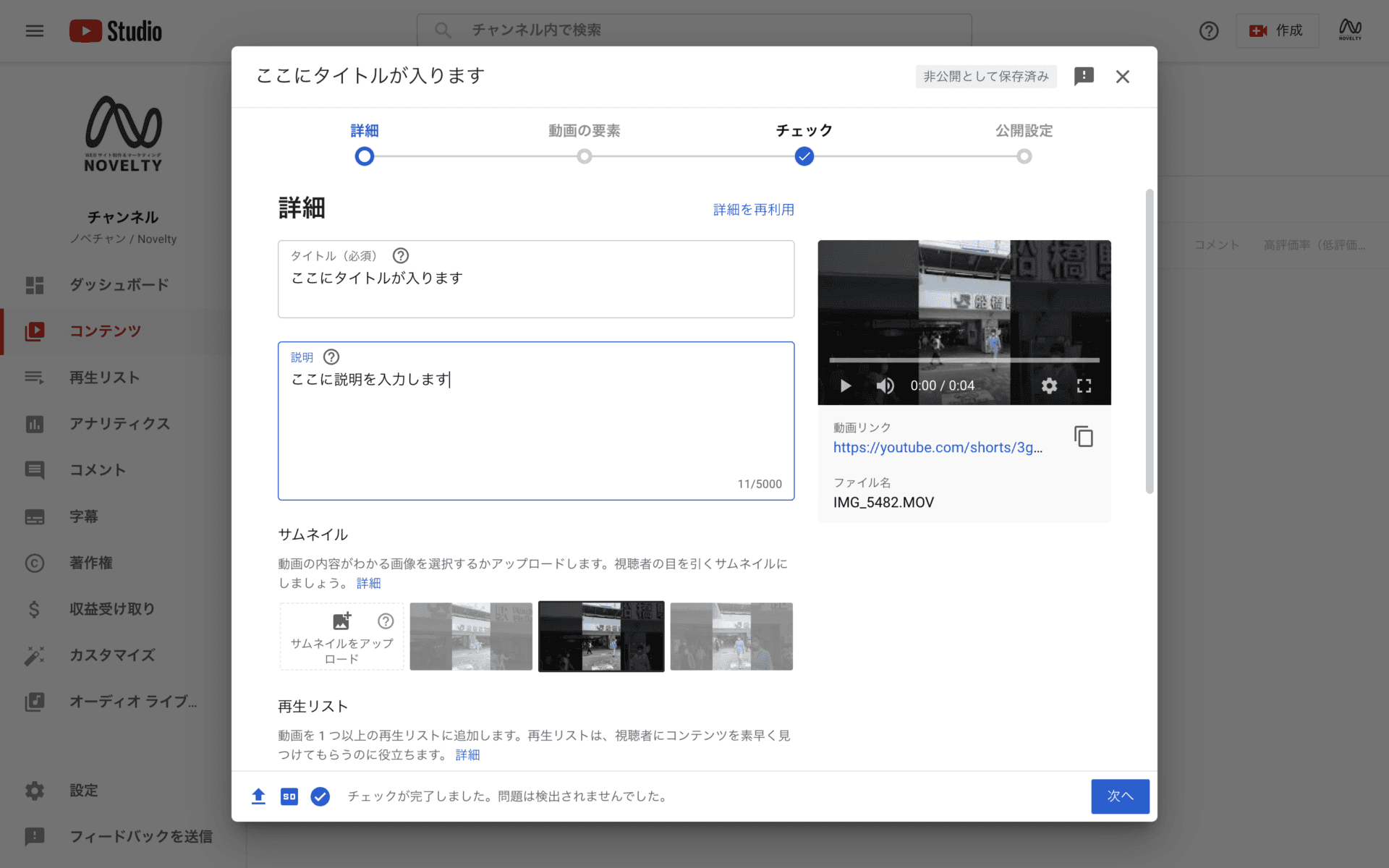 動画をアップロードすると投稿内容を編集する画面に切り替わります。