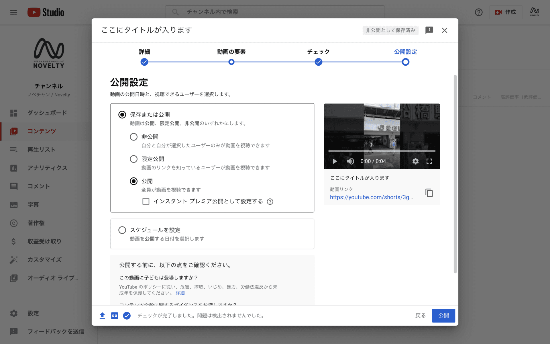 動画の要素、チェックまで進んだら最後は公開設定を行います。限定公開をしたい動画などであれば、限定公開にチェックをし全員に公開する場合は公開にチェックをしましょう。