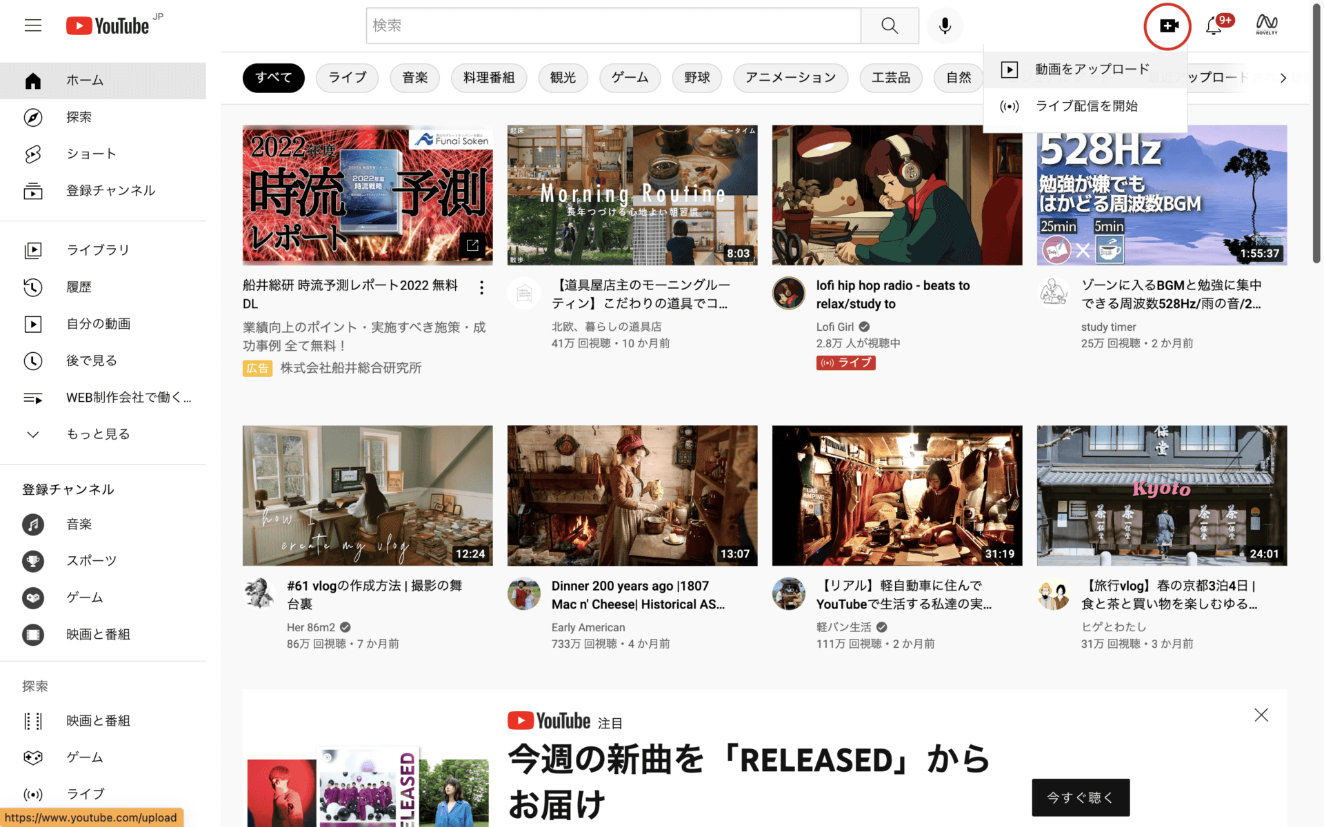 トップページの右上にあるカメラボタンを押します。カメラボタンを押すと「動画をアップロード」「ライブ配信を開始」と出てくるので「動画をアップロード」をクリックします。