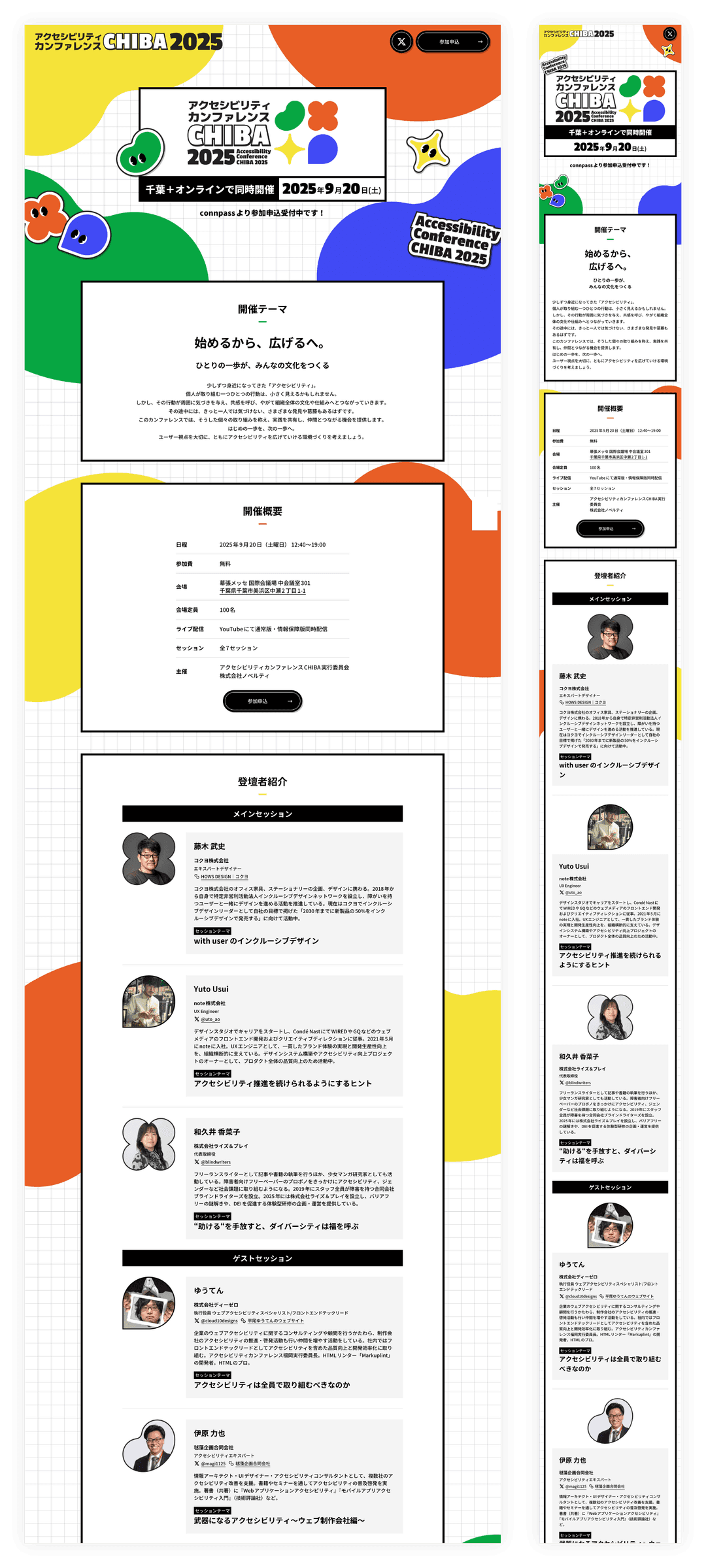 - アクセシビリティカンファレンスCHIBA2025の公式サイト制作を担当いたしました。 カンファレンスの情報発信や参加者募集を行うにあたり、アクセシビリティに取り組んだ経験が少ない方でも気軽に参加できる “お祭りのような雰囲気” を大切にしたサイトが求められました。