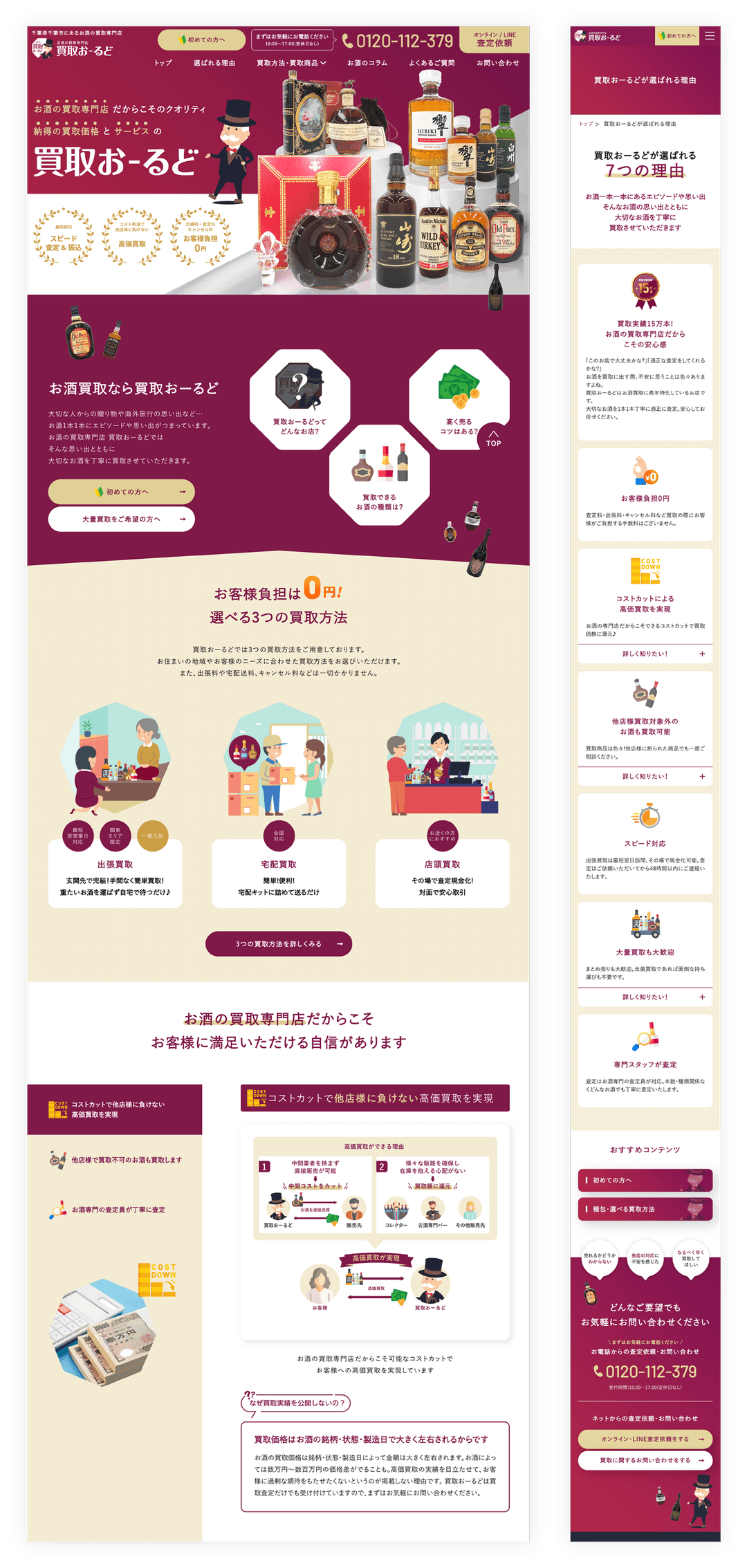 - 査定にまつわる流れや、買取商品についてしっかりと写真やイラストを用いてサイトに掲載することで、ユーザーの不安を無くし、安心して査定依頼まで進んでいただけるよう丁寧にコンテンツの隅々まで考えて構成を組んでおります。 サイト内の各所に使用しているフラットでありながらやさしい印象を与えるイラストは、ロゴデザインのテイストに合わせデザイナーの瀬川がお客様監修のもと作成いたしました。 その他、スクロールに合わせて追従するメニューでどこのページからもすぐに査定依頼やお問い合わせを行っていただける工夫をしております。