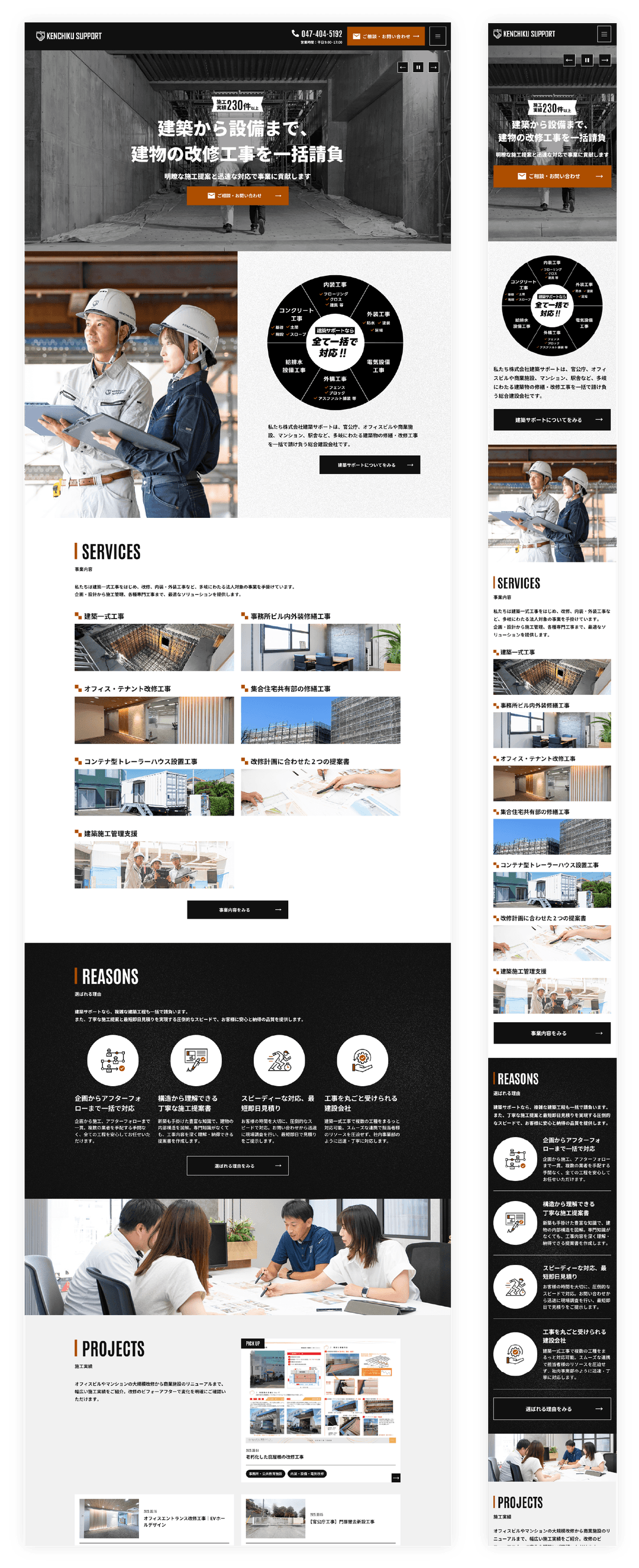 - 創業当初は建設業のサポート業務を中心に展開していた建築サポート様。事業拡大とともに自社での工事請負も増え、リフォームや外構、新築など幅広い案件に対応されてきました。 一方で近年は、公共施設や企業向けの大型案件が増加し、既存サイトでは事業の主軸や強みが十分に伝わりづらいという課題がありました。 今回のリニューアルでは、事業内容を再定義し、法人案件を主軸としたブランディングへ転換。 “街の建設会社”ではなく、“信頼されるパートナー企業”としての姿を明確に打ち出すコーポレートサイトを目指しました。