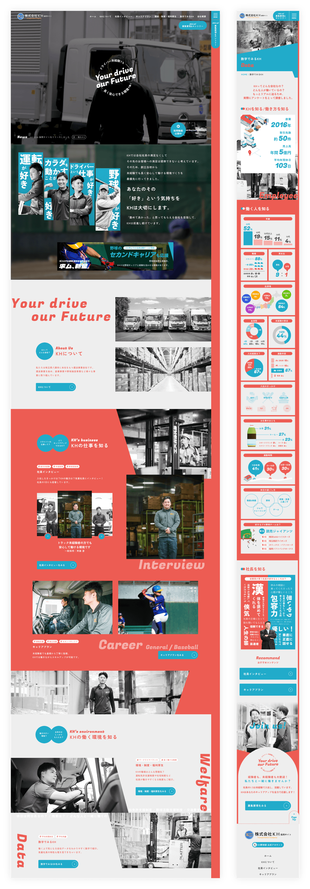 - KH様は「社員の“好き”を尊重すること」を大切にされており、その象徴的な取り組みが、同社に在籍する社会人野球チームの存在です。多くのメンバーが日常はドライバーとして働きながら、野球にも全力で取り組める環境が整えられています。 こうした背景を踏まえ、ビジュアルは野球チームをイメージさせるようなポップで明るい印象に統一。KH様らしい“好きなことを応援する職場”という空気感をデザインに落とし込みました。 また、ドライバー未経験者でも安心して働ける体制が整っている点をしっかり伝えるため、社員インタビュー、キャリアプラン紹介、福利厚生・制度の解説など、コンテンツ面も充実させています。 「野球を続けたいからKHに興味を持った方」、「野球はやらないが、経験を活かして働きやすい職場を探している方」、どちらのニーズにも応えられる、柔軟で前向きな採用サイトを目指しました。