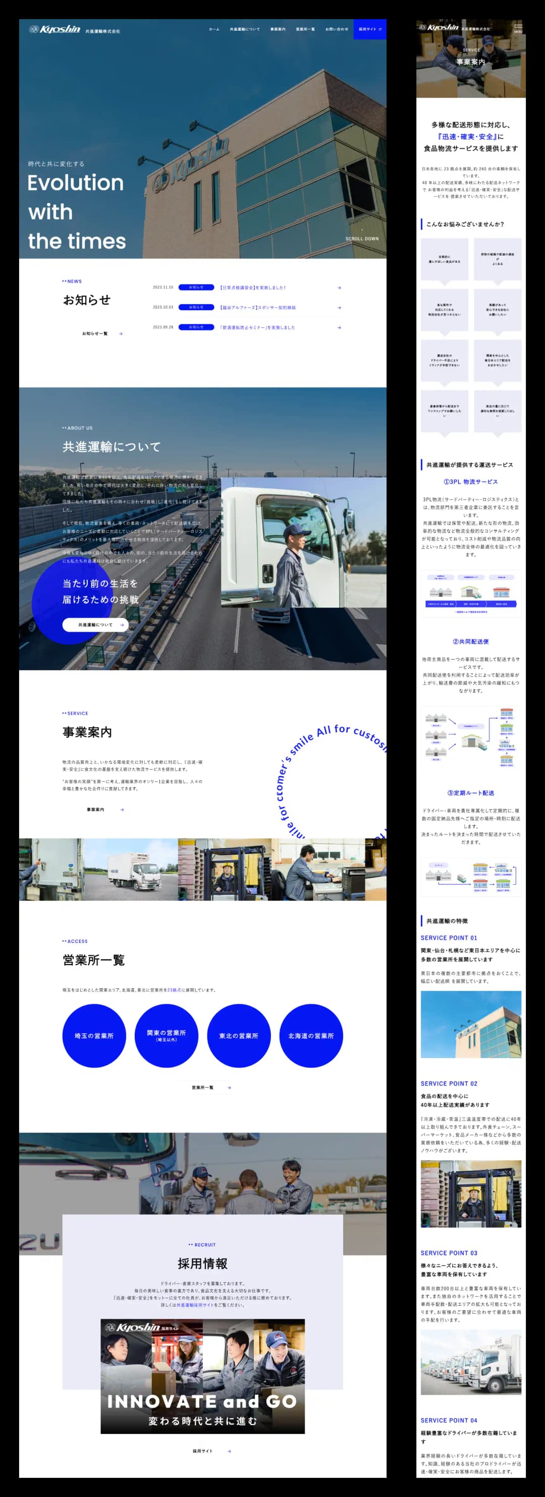 - コーポレートのロゴに使用しているブルーをサイト全体の刺し色として使用し、スッキリさや誠実さを印象付けるデザインに。 リニューアルに伴いサイト内のテキストも一新。 共進運輸様の想いをよりしっかりと、サイトを訪れる方へ届けられるようにいたしました。 お客様の笑顔を第一に考え、時代と共に変化していく共進運輸の次なる挑戦をこれからも私たちは応援し続けていきます。
