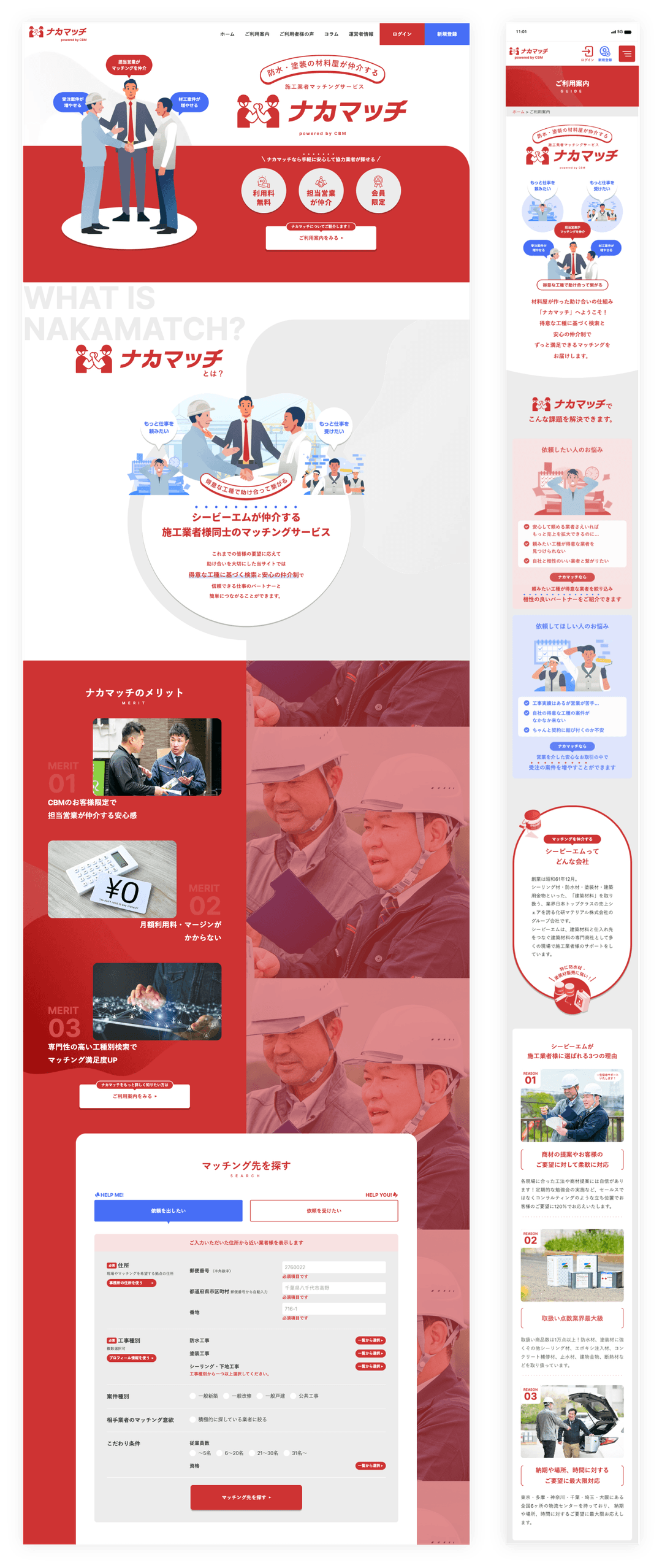 - 2023年4月にリリースしたコーポレートサイト・採用サイトに引き続き、新規で制作するマッチングサイトの制作パートナーとして再び弊社にご依頼いただきました。 シービーエム様は、建築・土木材料の販売・卸売りを行っている専門商社。取引先のお客様からのご紹介のご依頼をいただくことも増え、タイミングやリソースが間に合わず機会損失してしまうことも少なくありませんでした。自社の経験や経営資源を活かし、「職人さんをつなぐマッチングサイト」を制作したいとのご希望でプロジェクトがスタートしました。