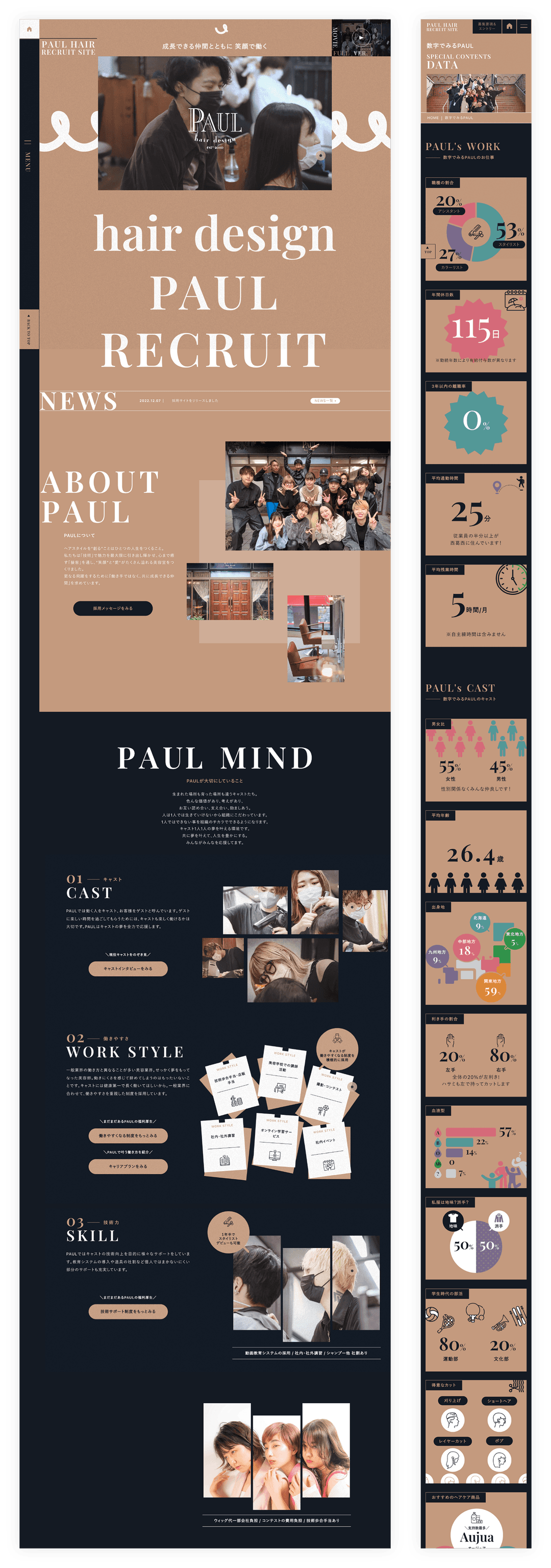 - サイトのカラーはお客様のご要望をお聞きしながら、よりよいカラーの組み合わせを探りました。 お写真はすべてお客様が撮影。 頂いたお写真をサイトに合わせて色調をそろえ、使用しています。 個性が出ている「数字で見るPAUL」のコンテンツはキャストの皆様にアンケートを実施。 頂いた回答を基にオリジナルのアイコンデザインとカラフルなカラーリング、バリエーションに富んだアニメーションを用いて楽しいページにいたしました。